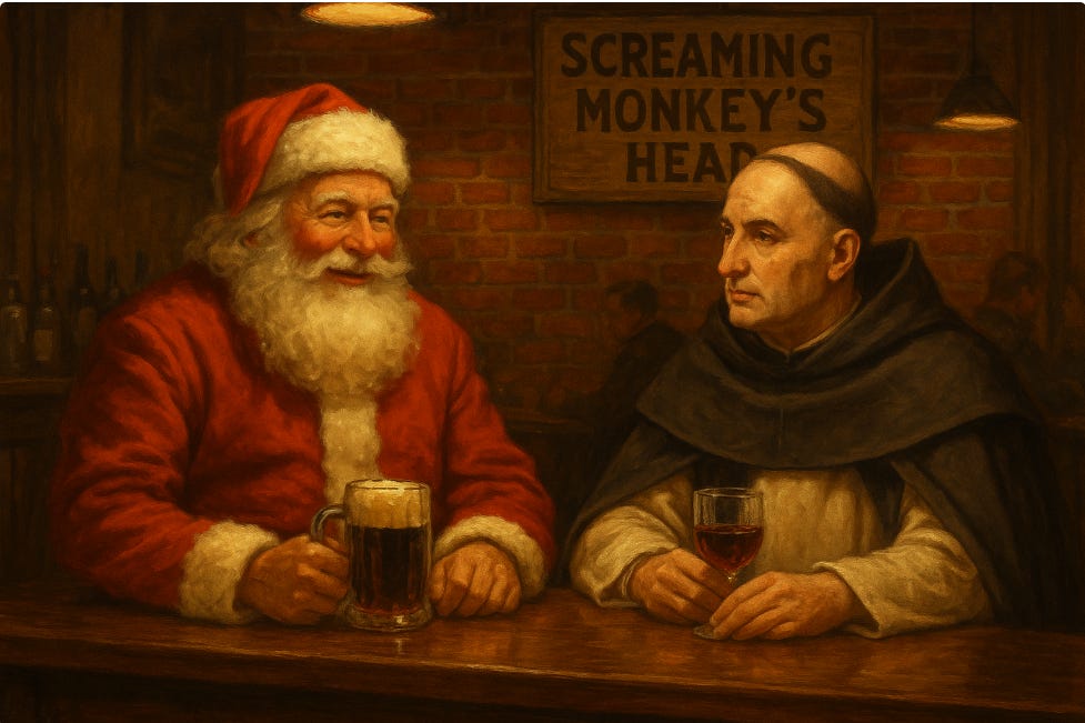 Santa walked to the bar and clapped Thomas on the back, sat down and Kindly Bob slipped an opaque glass of Guinness in front of him. “Ah, yes,” said Santa and had himself a healthy swallow. Holding the stout between him and Kindly Bob, he said with a wink, “It’s always darkest afore the dawn.” Wiping the creamy froth from his moustache he turned to Aquinas. “Well, now Tommy, have you been a good boy?”