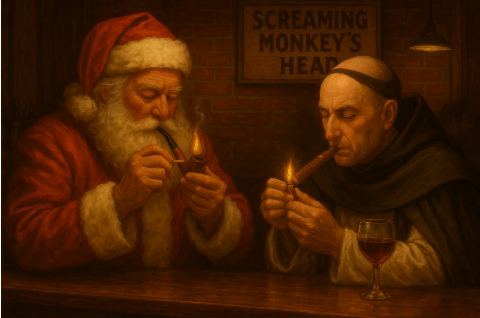 Aquinas put his cigar down in the ash tray, stood and bowed to Santa and said, “Thanks, time for evening prayer. Always a pleasure Nick.” Santa smiled and nodded and watched Aquinas leave the bar. Turning to Kindly Bob he said, “Switching back to Stout, Bobby my boy.” Kindly Bob went to get a fresh glass.